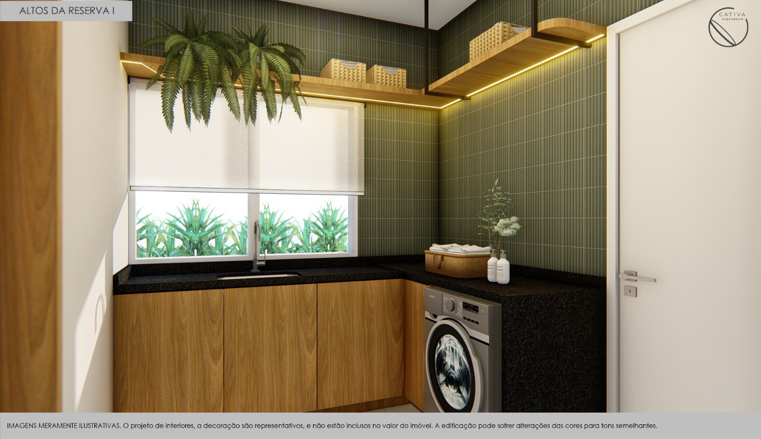 Lavanderia equipada com móveis planejados, estrutura metálica e bancada em pedra