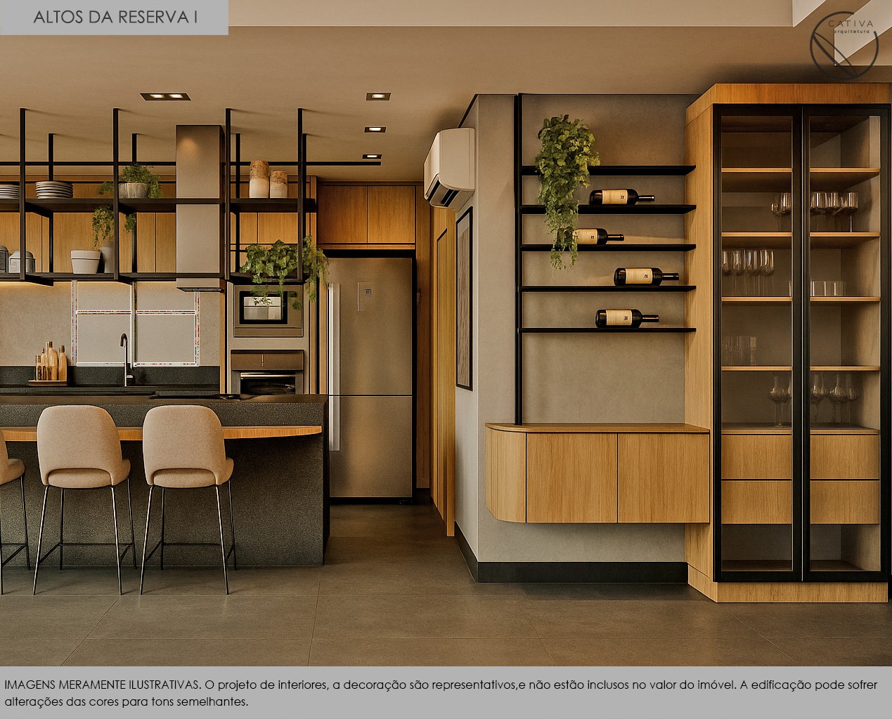 Adega/Cristaleira com móvel fixo em vidro e estrutura metálica
