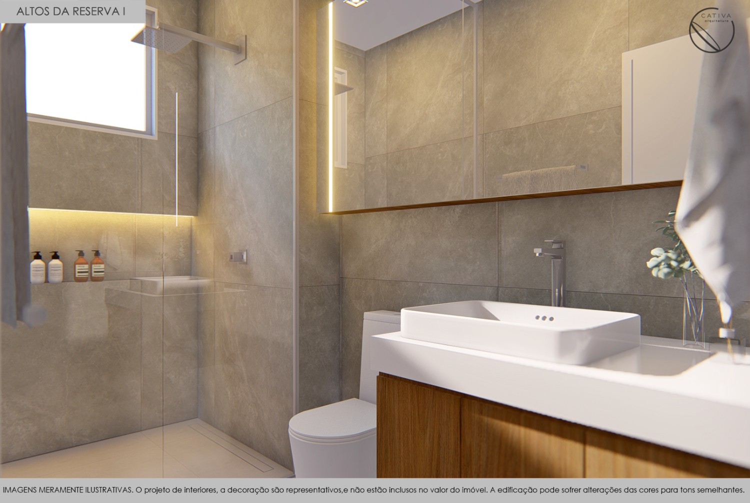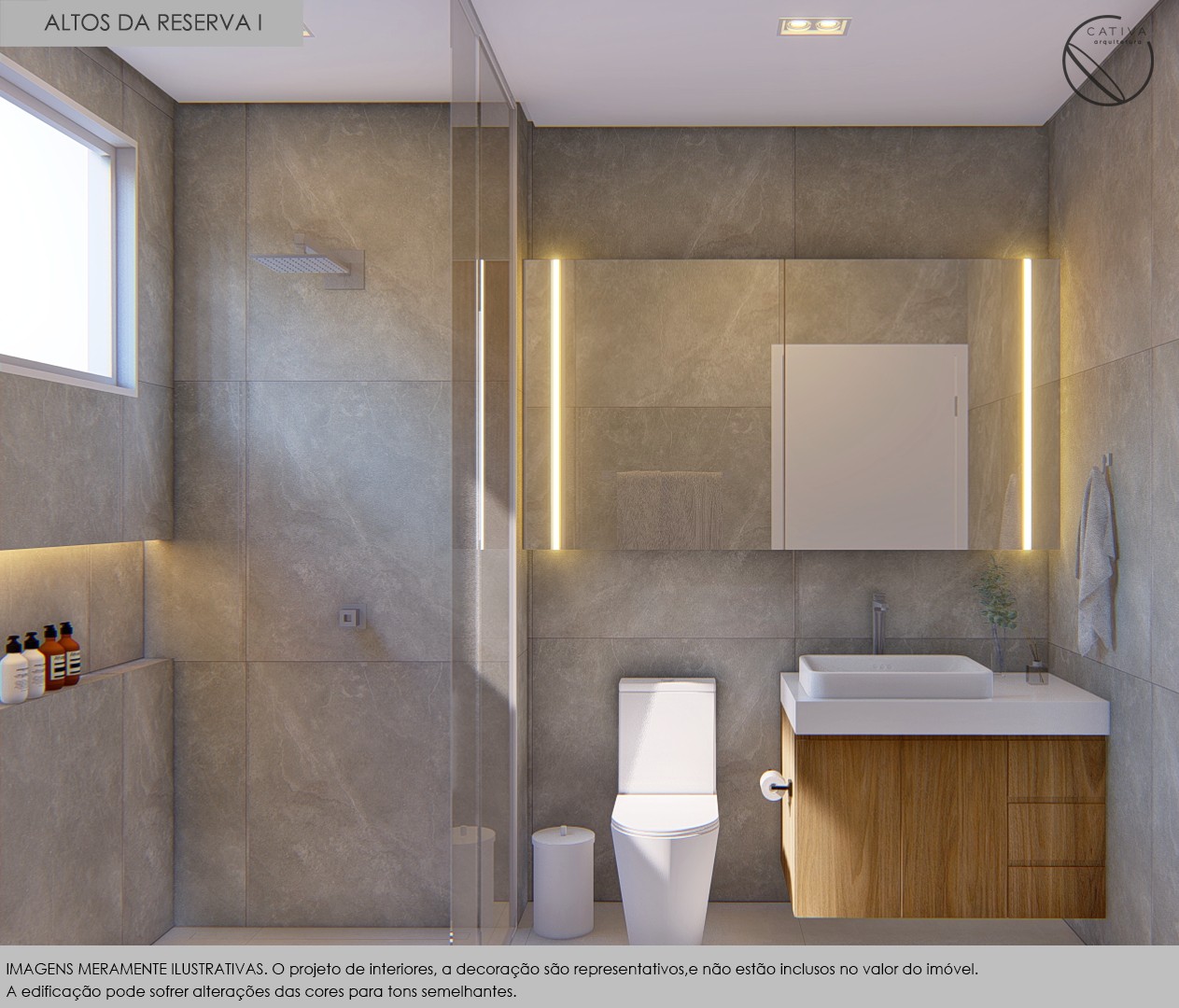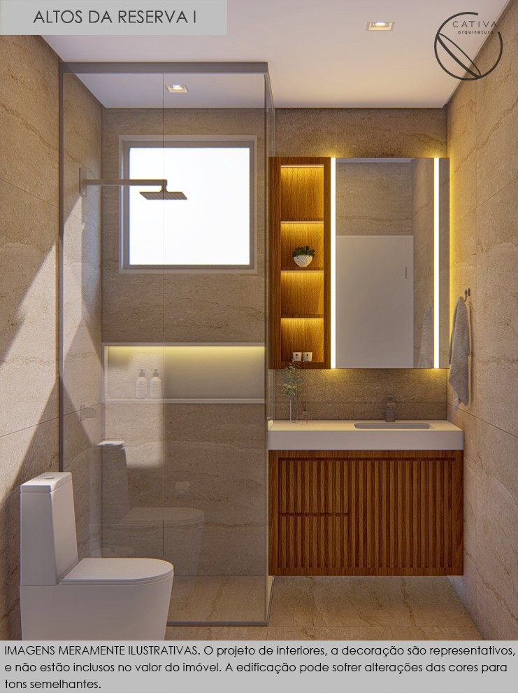 Banheiros com móveis fixos, box, torneiras e pedras
